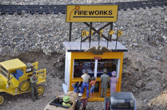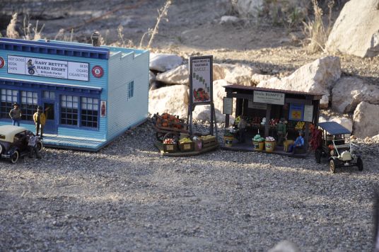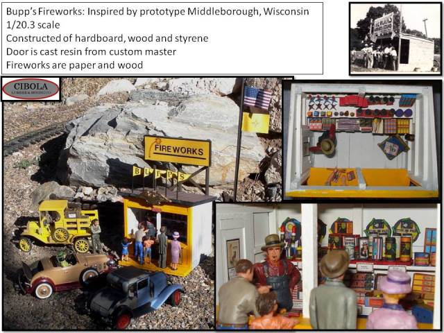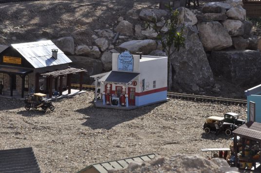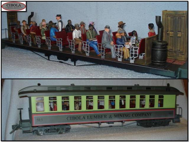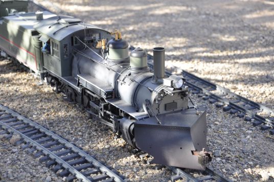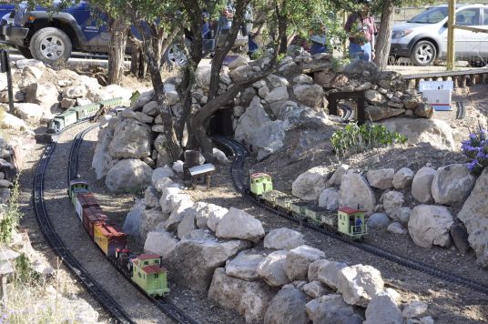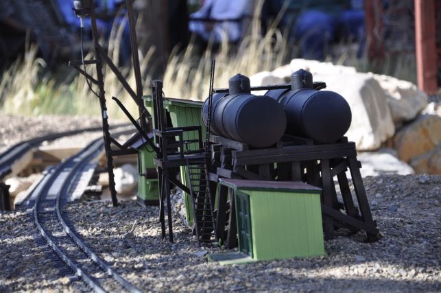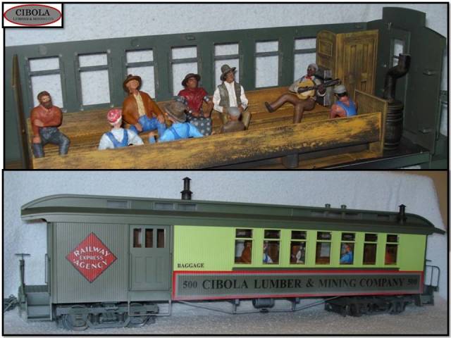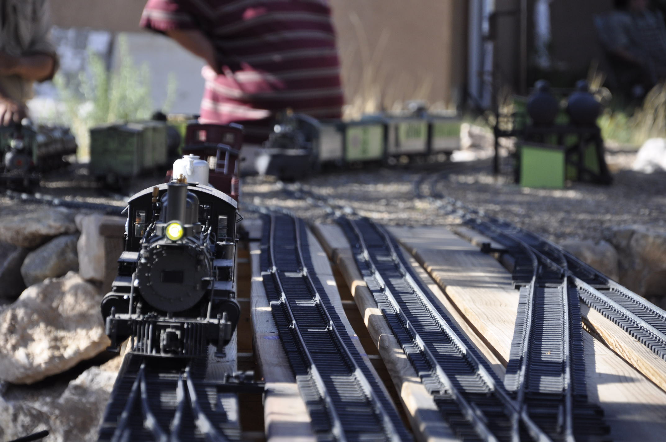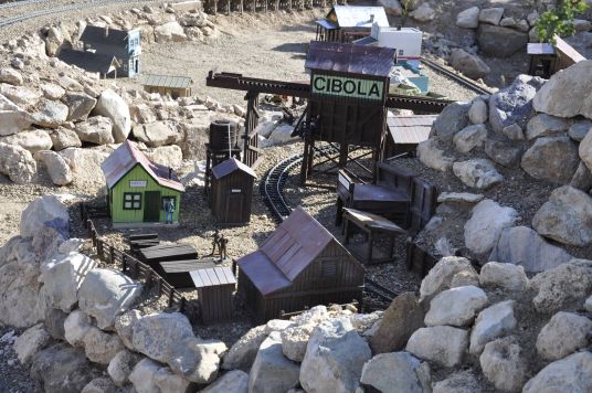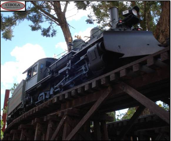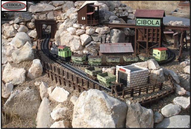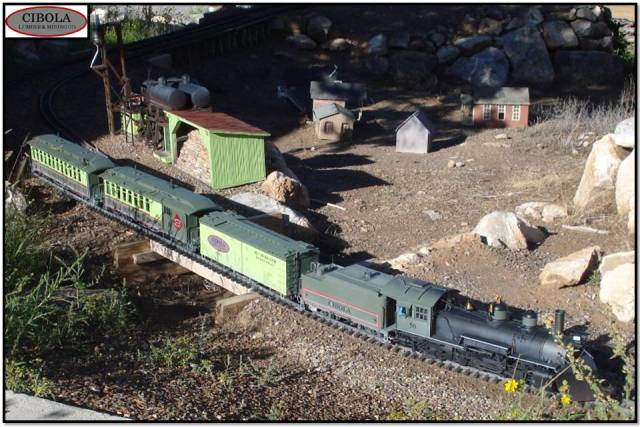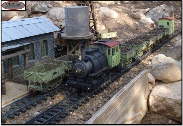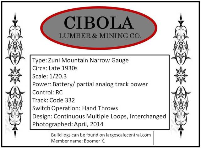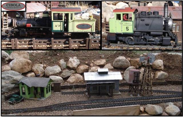 Cibola Lumber and Ming Company .... (Note photos of 2014 East Mountain Tour below RR Cibola specs.)Boomer's 1/20.3 Cibola Lumber and Ming Company is based on the succession of lumber companies that operated in the Zuni Mountains of North West New Mexico from 1890 until 1950. The line is moderately dated at 1938. Running in a horse shoe from Santa Fe South to Albuquerque and then heading back North to Farmington it includes the fictional towns of Cibola and Broken Wheel. The layout features a double track main line with 20' radius curves and a mining loop with 2' radius curves. Future plans include a passing siding at Cibola and branch loop to servicing a stock yard and several logging camps. Total track is currently 350'. The mining loop is track powered but the mainline is battery powered. Engines use Airwire G2 decoders with Phoenix P8 sound systems. |