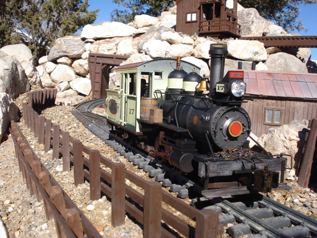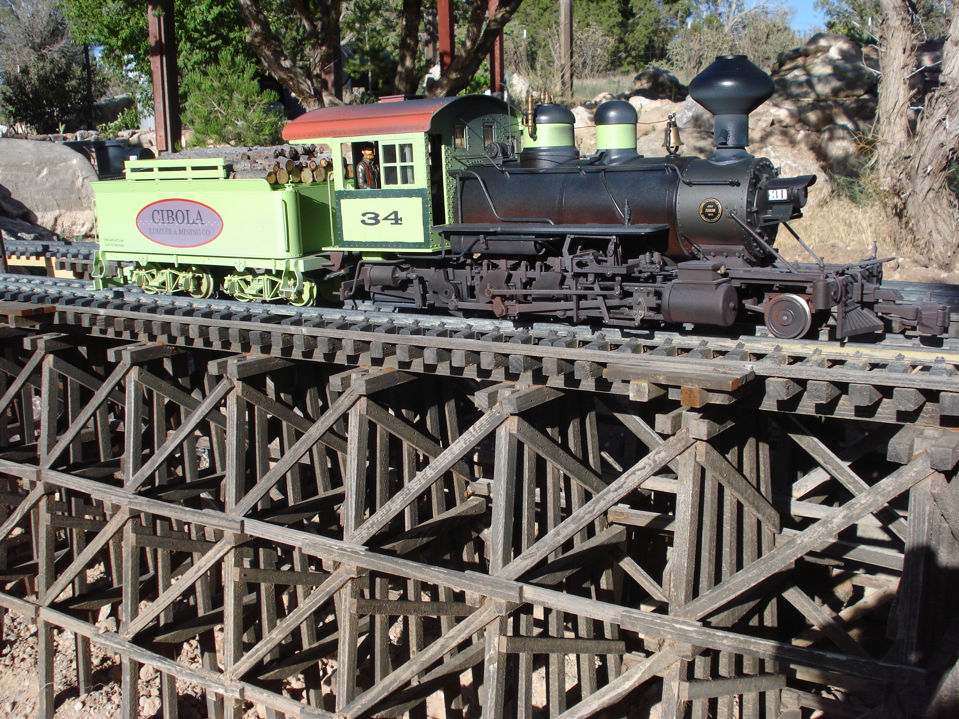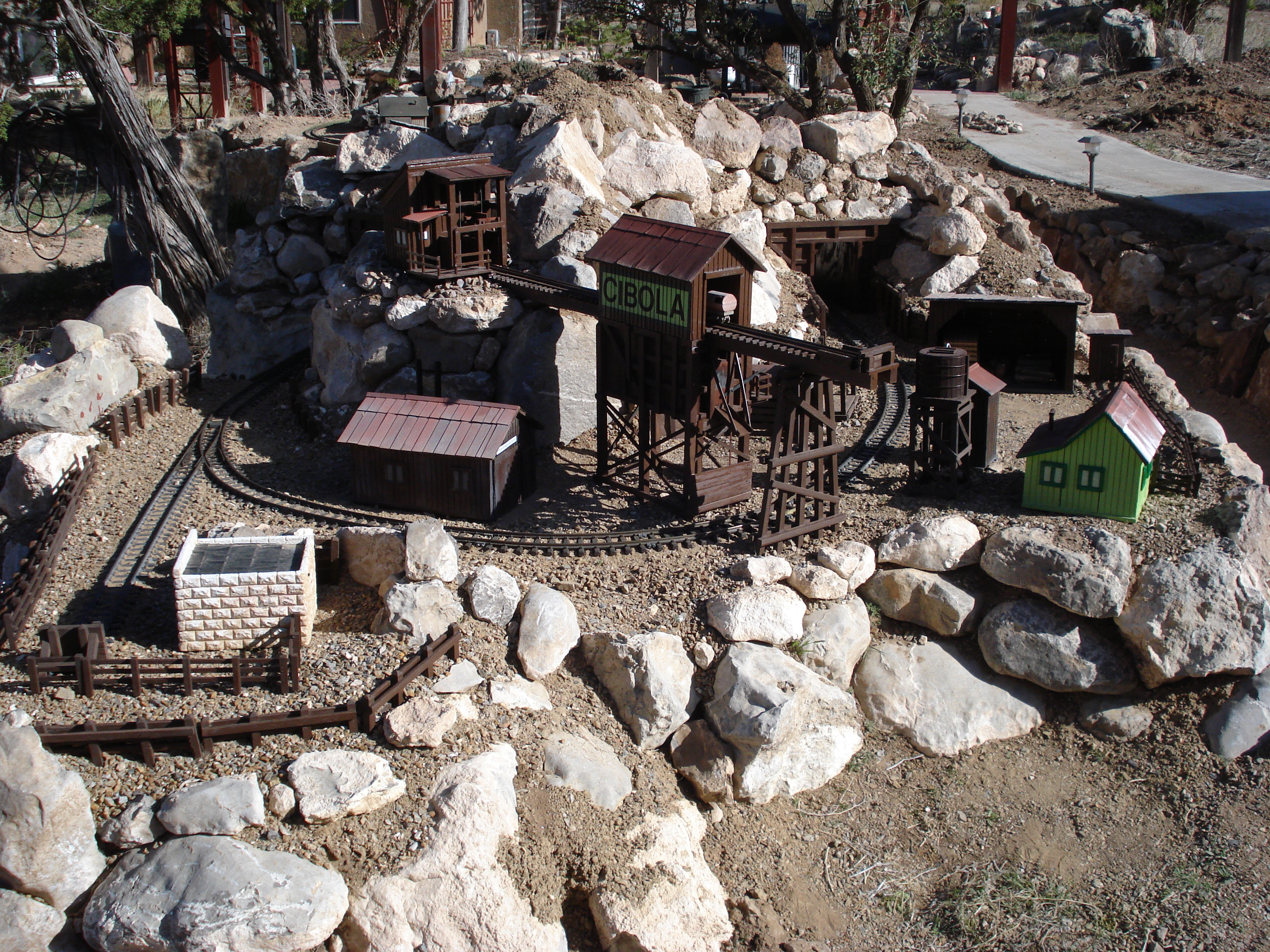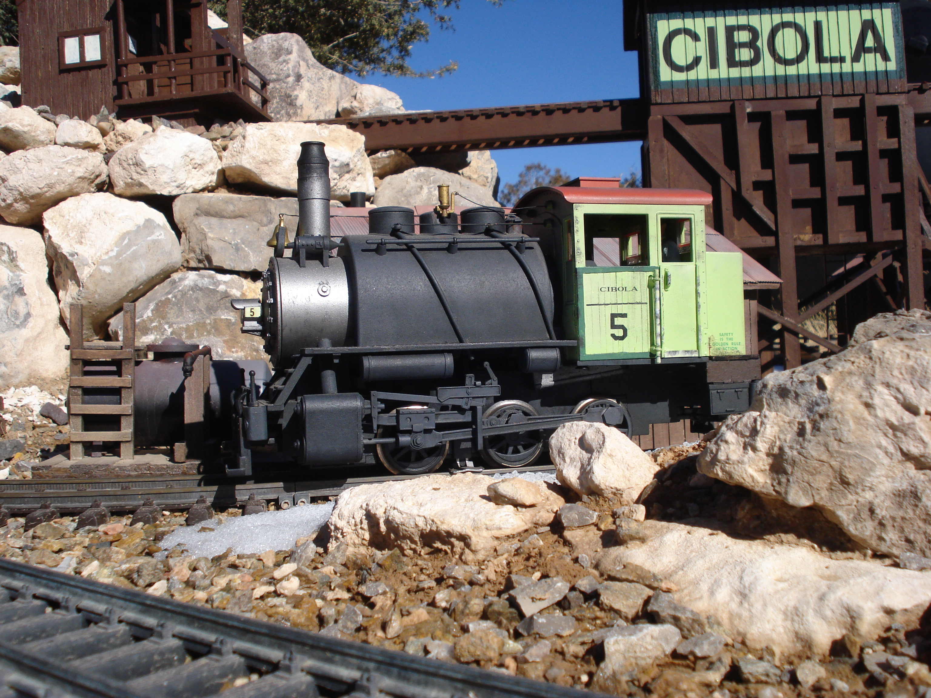 Cibola Lumber and Ming CompanyBoomer's 1/20.3 Cibola Lumber and Ming Company is based on the succession of lumber companies that operated in the Zuni Mountains of North West New Mexico from 1890 until 1950. The line is moderately dated at 1938. Running in a horse shoe from Santa Fe South to Albuquerque and then heading back North to Farmington it includes the fictional towns of Cibola and Broken Wheel. The layout features a double track main line with 20' radius curves and a mining loop with 2' radius curves. Future plans include a passing siding at Cibola and branch loop to servicing a stock yard and several logging camps. Total track is currently 350'. The mining loop is track powered but the mainline is battery powered. Engines use Airwire G2 decoders with Phoenix P8 sound systems. |