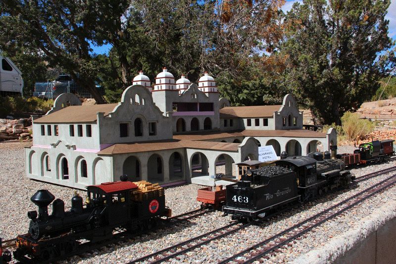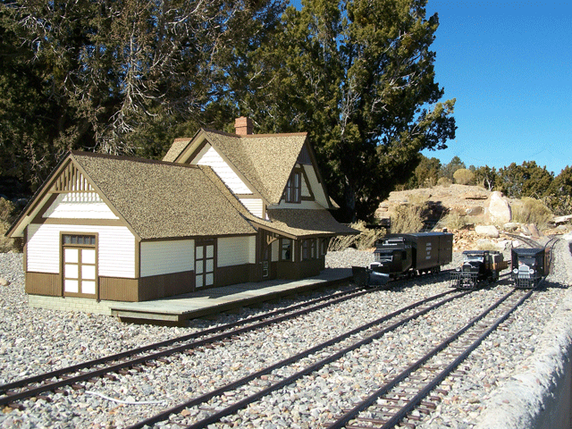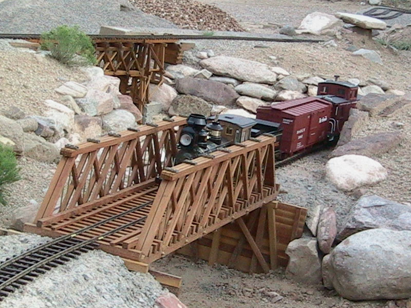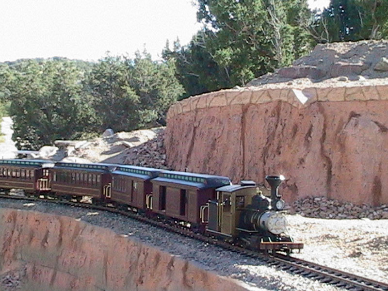 Zia and Columbine RRThis layout is 60 by 100 feet with about 470 feet of track. There is a 217 foot loop wiich is flat for running manually controled live steam locomotives and an upper loop with 3 1/2 % grades. All the buildings on the RR, present and future, are models of historic NM and CO structures. |