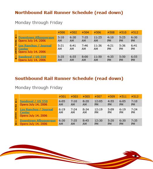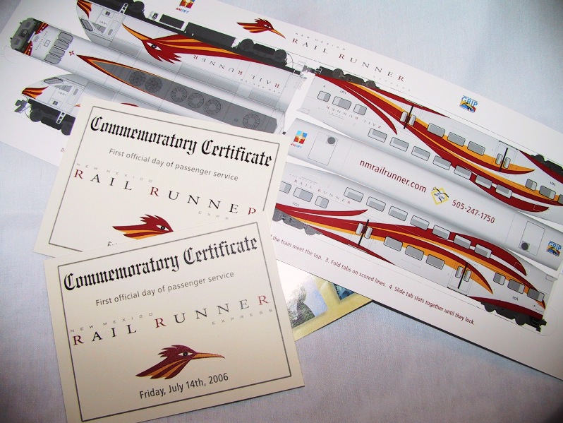 We took a ride on opening day, 7/14/06, on Railrunner. The price was right, free. We had a great fun, took the 11:25 to Bernalillo. Everything was right was on time, smooth and fast about 80 MPH. There were almost 1,000 people on our run. 3 cars, standing room only and packed tight. Lots of kids and everyone smiling. It was great to be a part of the history of New Mexico!