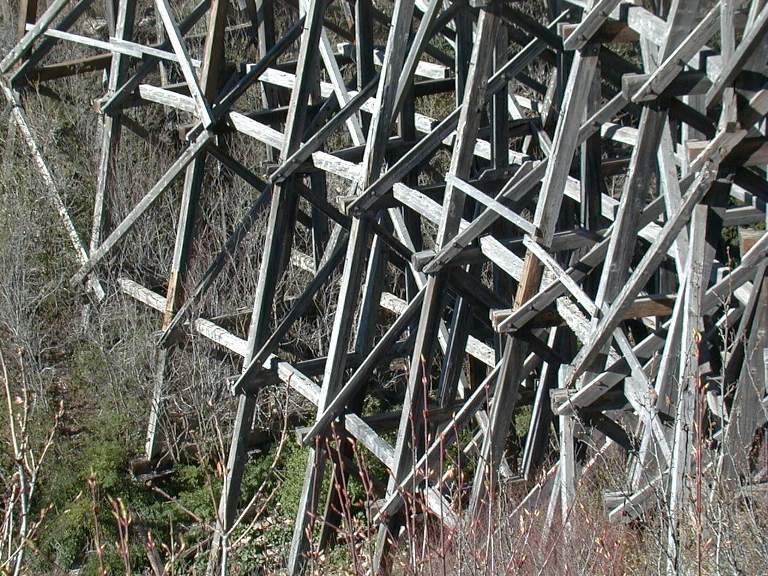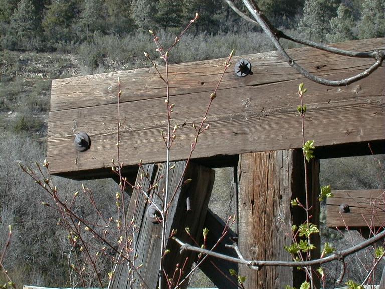 Photos of a New Mexico Railroad Icon The Alamogordo and Sacramento Mountain Railroad has one of the most recognizable landmarks in New Mexico. It is the Trestle at Mexican Canyon on the road to Cloudcroft from Alamogordo. The standard gauge A&SM ran steeper grades and tighter radii than most narrow gauge railroads. Grades were as steep as 6 1/2 percent and radii of 193 foot, that is 30 degree. In some cases only a switchback would work. This was a passenger, freight and mainly lumber railroad. You can hike down the old grade and look at the Trestle. Here are some close ups of the construction for those of you who are considering trestle construction. I will add a few more later. Help preserve the trestle. Look up the New Mexico Rails-to-Trails Assoc. (NMRT) and make a donation! |